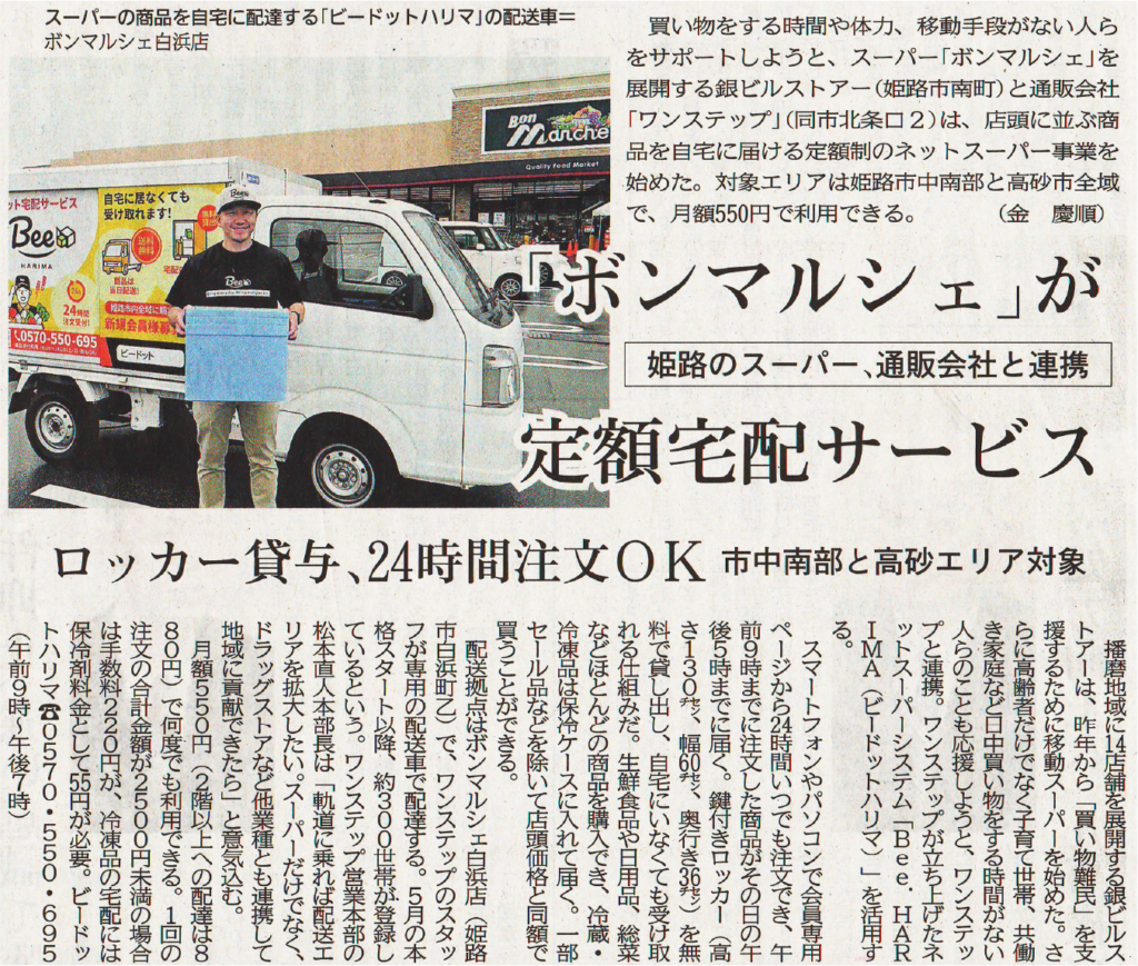 「 Bee.HARIMA 」・午前9時までの注文で当日午後5時までにお届け・鍵付きロッカーを無料で貸し出し・生鮮食品や日用品、惣菜などが店頭価格で購入可能・冷蔵/冷凍品は保冷ケースに入れてお届け