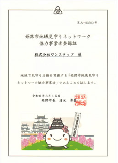 当社は、姫路市内で高齢者のお買い物を支援するサービスを通じて、専任サポーターや配送スタッフの巡回時に、高齢者の方にいつもと違った異変があった場合に、行政に速やかに連絡するという「姫路市地域見守りネットワーク事業」の協力事業者に認定されました。